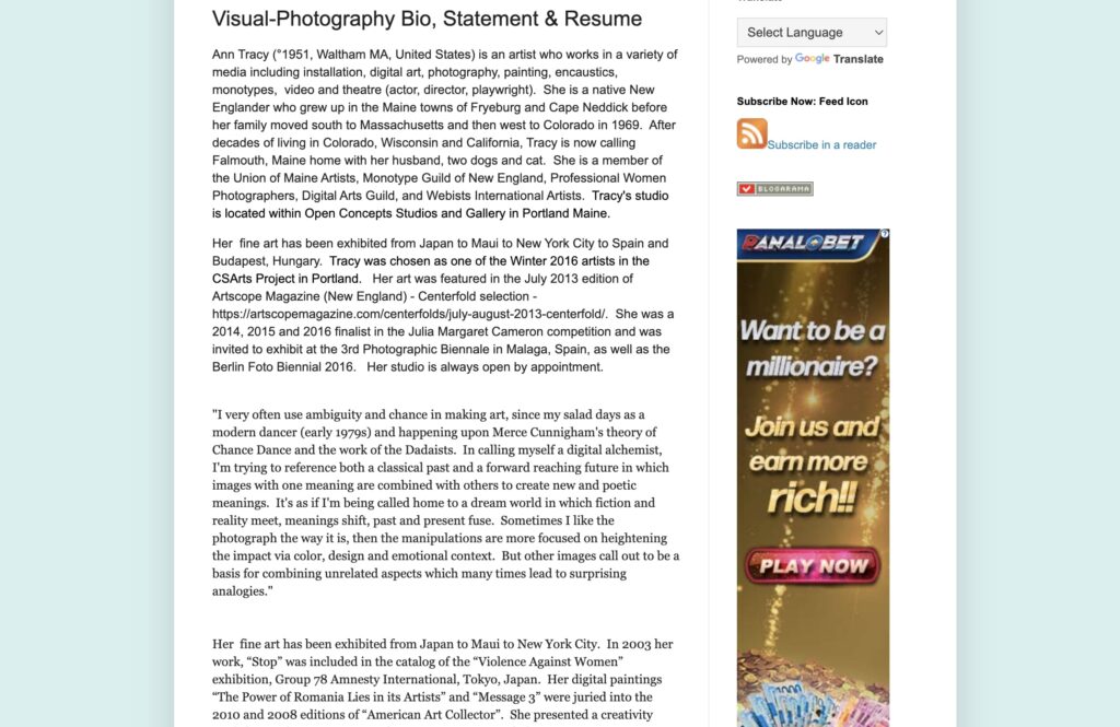 Ann Tracy (°1951, Waltham MA, United States) is an artist who works in a variety of media including installation, digital art, photography, painting, encaustics, monotypes, video and theatre (actor, director, playwright). She is a native New Englander who grew up in the Maine towns of Fryeburg and Cape Neddick before her family moved south to Massachusetts and then west to Colorado in 1969. After decades of living in Colorado, Wisconsin and California, Tracy is now calling Falmouth, Maine home with her husband, two dogs and cat. She is a member of the Union of Maine Artists, Monotype Guild of New England, Professional Women Photographers, Digital Arts Guild, and Webists International Artists. Tracy’s studio is located within Open Concepts Studios and Gallery in Portland Maine.