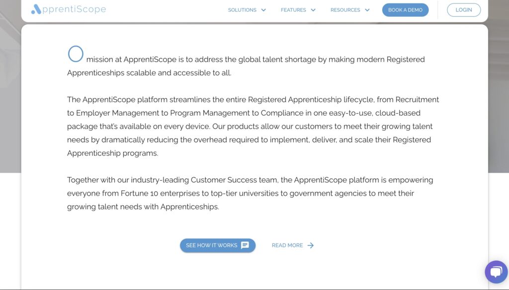The mission at ApprentiScope is to address the global talent shortage by making modern Registered Apprenticeships scalable and accessible to all.
