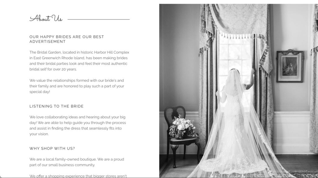 The Bridal Garden, located in historic Harbor Hill Complex in East Greenwich Rhode Island, has been making brides and their bridal parties look and feel their most authentic bridal self for over 20 years.