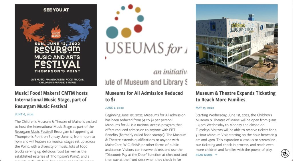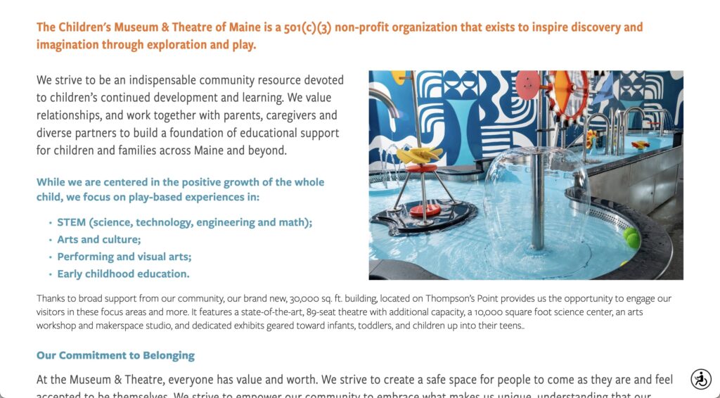 The Children’s Museum & Theatre of Maine was created through a 2008 merger of two children’s organizations–both of them with deep roots in Portland and both founded by the Junior League of Portland. The Museum & Theatre includes the oldest continuously operating children’s theatre in the nation, originally founded as the Children’s Theatre of Maine in 1923 and now named Maddy’s Theatre. Over eighty years later, in 2008, the theatre merged with the Children’s Museum of Maine (which was founded in 1976).