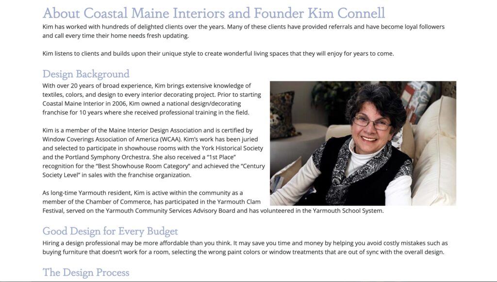 Kim is a member of the Maine Interior Design Association and is certified by Window Coverings Association of America (WCAA). Kim’s work has been juried and selected to participate in showhouse rooms with the York Historical Society and the Portland Symphony Orchestra. She also received a “1st Place” recognition for the “Best Showhouse Room Category” and achieved the “Century Society Level” in sales with the franchise organization.