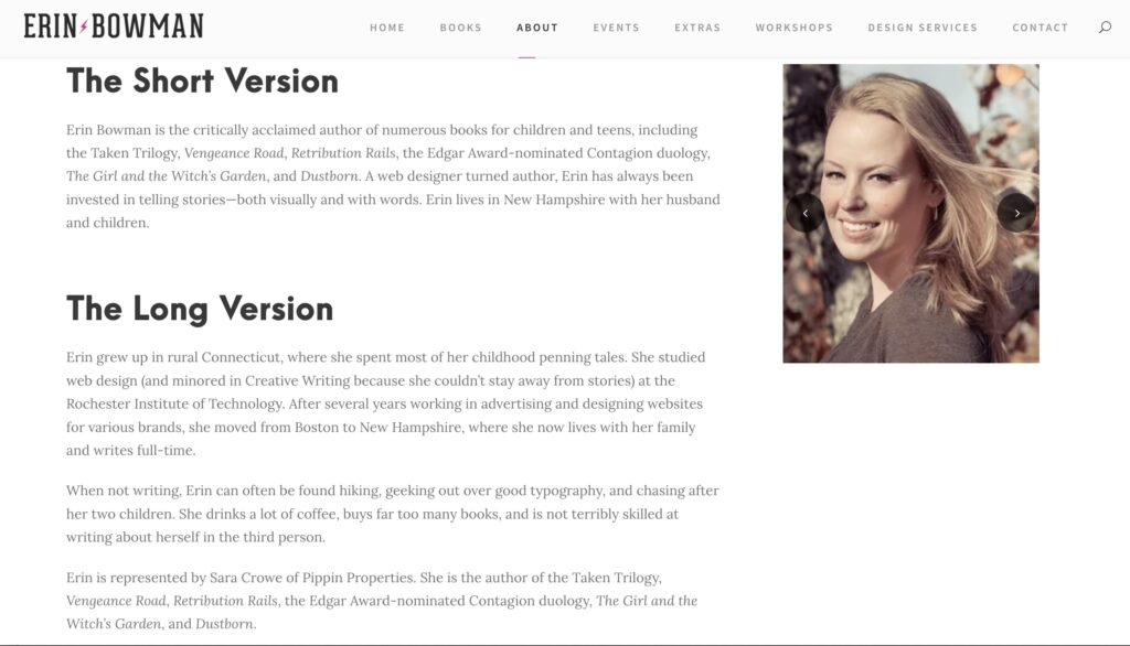 Erin grew up in rural Connecticut, where she spent most of her childhood penning tales. She studied web design (and minored in Creative Writing because she couldn’t stay away from stories) at the Rochester Institute of Technology. After several years working in advertising and designing websites for various brands, she moved from Boston to New Hampshire, where she now lives with her family and writes full-time.