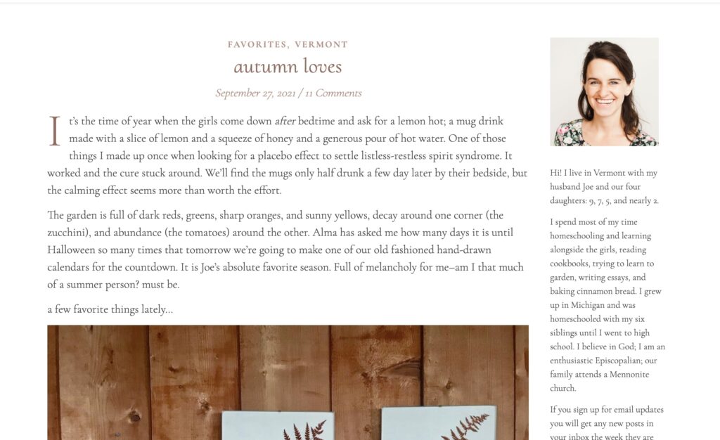 I spend most of my time homeschooling and learning alongside the girls, reading cookbooks, trying to learn to garden, writing essays, and baking cinnamon bread. I grew up in Michigan and was homeschooled with my six siblings until I went to high school. I believe in God; I am an enthusiastic Episcopalian; our family attends a Mennonite church.