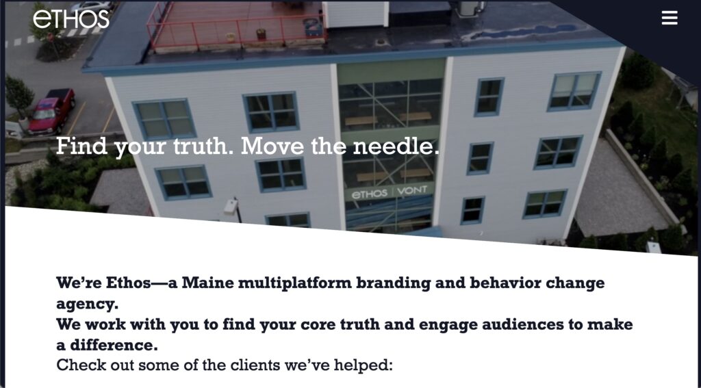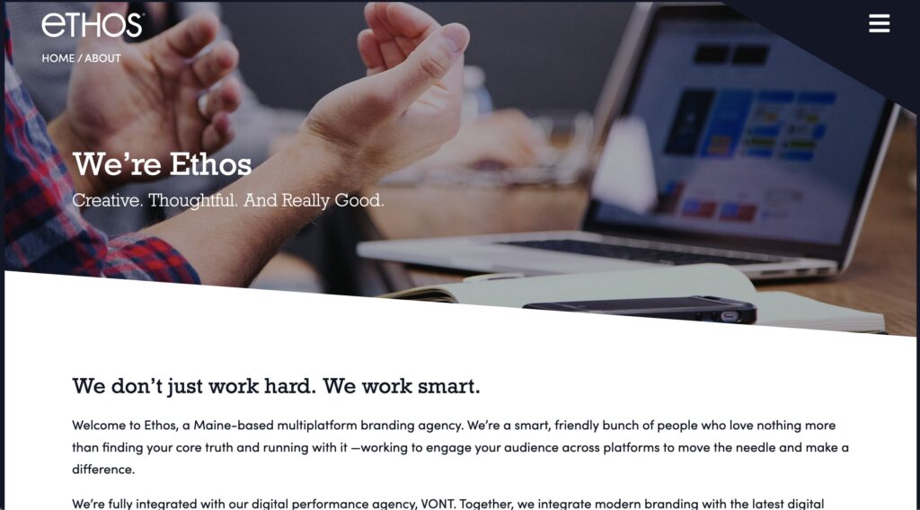 Welcome to Ethos, a Maine-based multiplatform branding agency. We’re a smart, friendly bunch of people who love nothing more than finding your core truth and running with it —working to engage your audience across platforms to move the needle and make a difference.