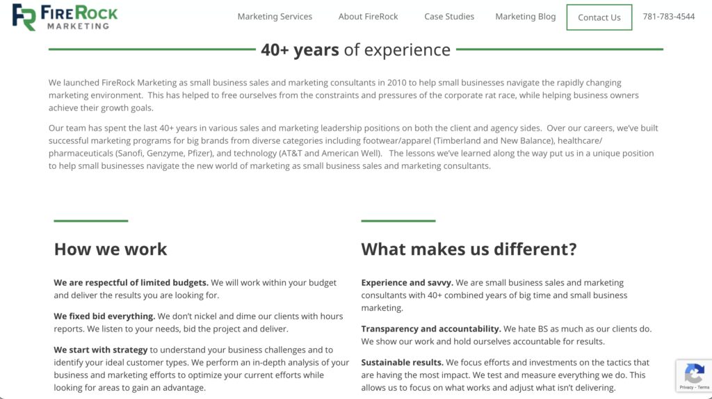 Our team has spent the last 40+ years in various sales and marketing leadership positions on both the client and agency sides.  Over our careers, we’ve built successful marketing programs for big brands from diverse categories including footwear/apparel (Timberland and New Balance), healthcare/ pharmaceuticals (Sanofi, Genzyme, Pfizer), and technology (AT&T and American Well).   The lessons we’ve learned along the way put us in a unique position to help small businesses navigate the new world of marketing as small business sales and marketing consultants.