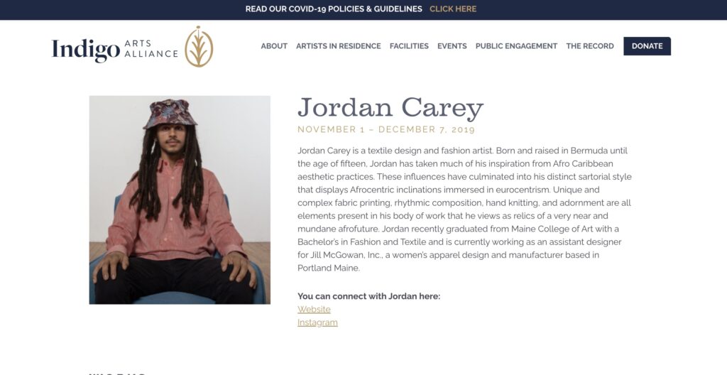 Jordan Carey is a textile design and fashion artist. Born and raised in Bermuda until the age of fifteen, Jordan has taken much of his inspiration from Afro Caribbean aesthetic practices. These influences have culminated into his distinct sartorial style that displays Afrocentric inclinations immersed in eurocentrism. Unique and complex fabric printing, rhythmic composition, hand knitting, and adornment are all elements present in his body of work that he views as relics of a very near and mundane afrofuture. Jordan recently graduated from Maine College of Art with a Bachelor’s in Fashion and Textile and is currently working as an assistant designer for Jill McGowan, Inc., a women’s apparel design and manufacturer based in Portland Maine.