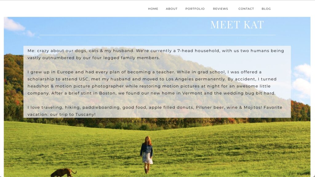 I grew up in Europe and had every plan of becoming a teacher. While in grad school, I was offered a scholarship to attend USC, met my husband and moved to Los Angeles permanently. By accident, I turned headshot & motion picture photographer while restoring motion pictures at night for an awesome little company. After a brief stint in Boston, we found our new home in Vermont and the wedding bug bit hard.