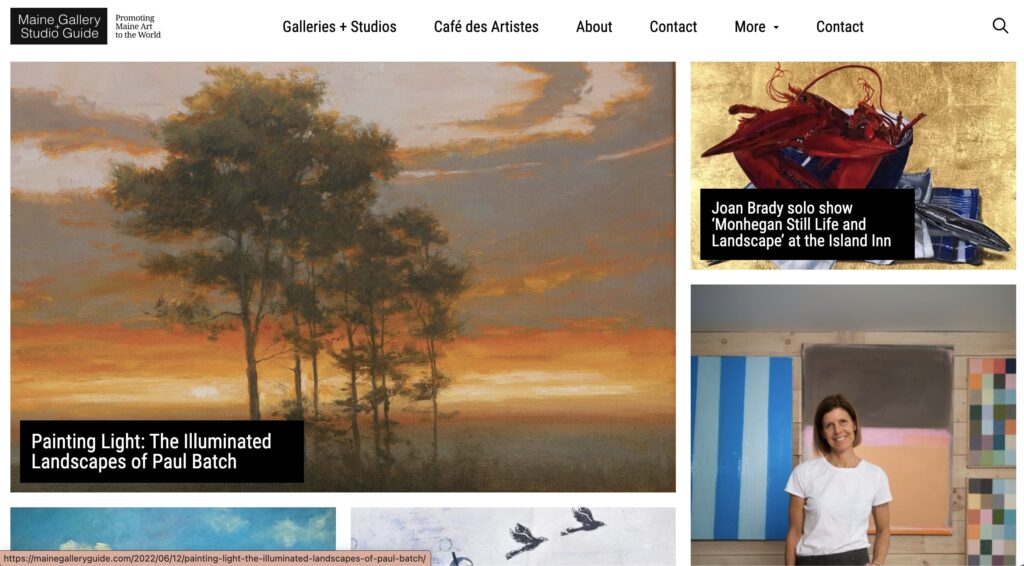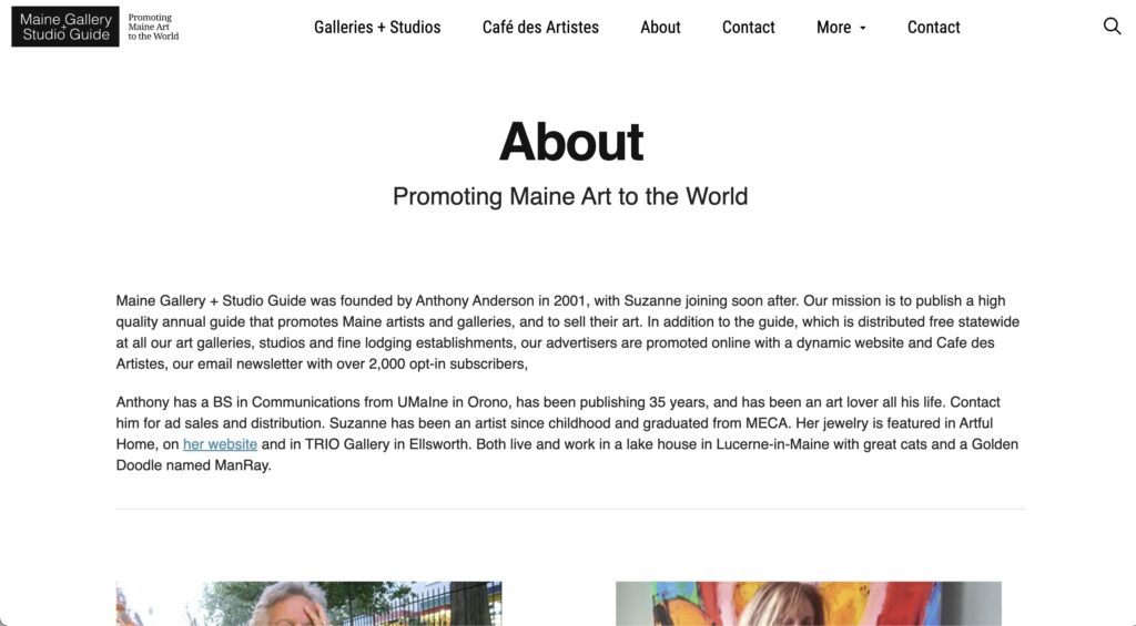 Maine Gallery + Studio Guide was founded by Anthony Anderson in 2001, with Suzanne joining soon after. Our mission is to publish a high quality annual guide that promotes Maine artists and galleries, and to sell their art. In addition to the guide, which is distributed free statewide at all our art galleries, studios and fine lodging establishments, our advertisers are promoted online with a dynamic website and Cafe des Artistes, our email newsletter with over 2,000 opt-in subscribers,