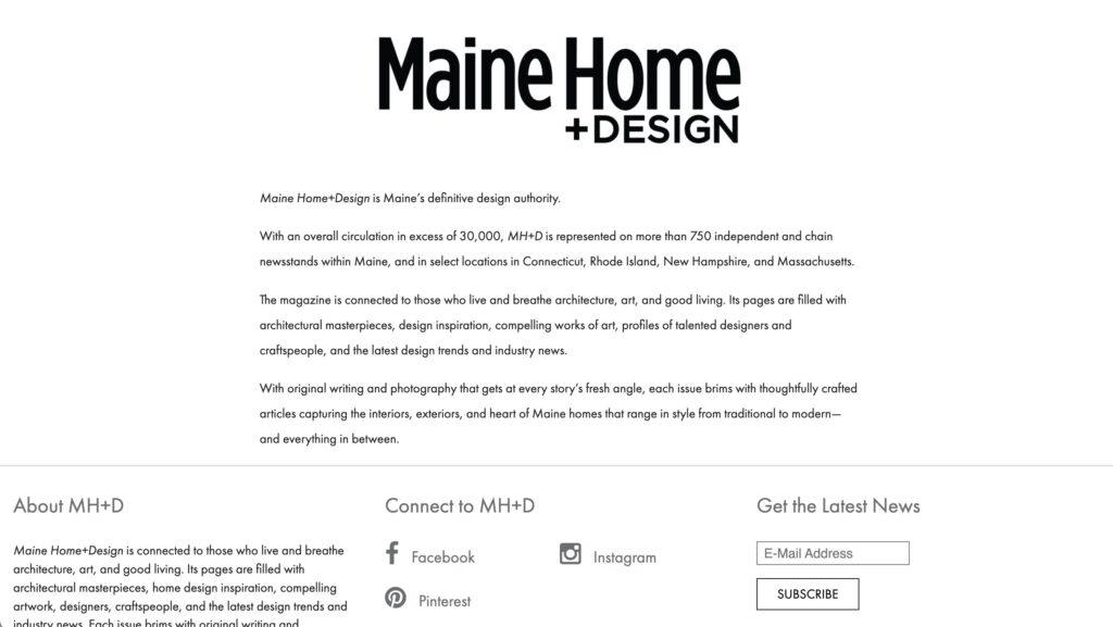 With an overall circulation in excess of 30,000, MH+D is represented on more than 750 independent and chain newsstands within Maine, and in select locations in Connecticut, Rhode Island, New Hampshire, and Massachusetts.