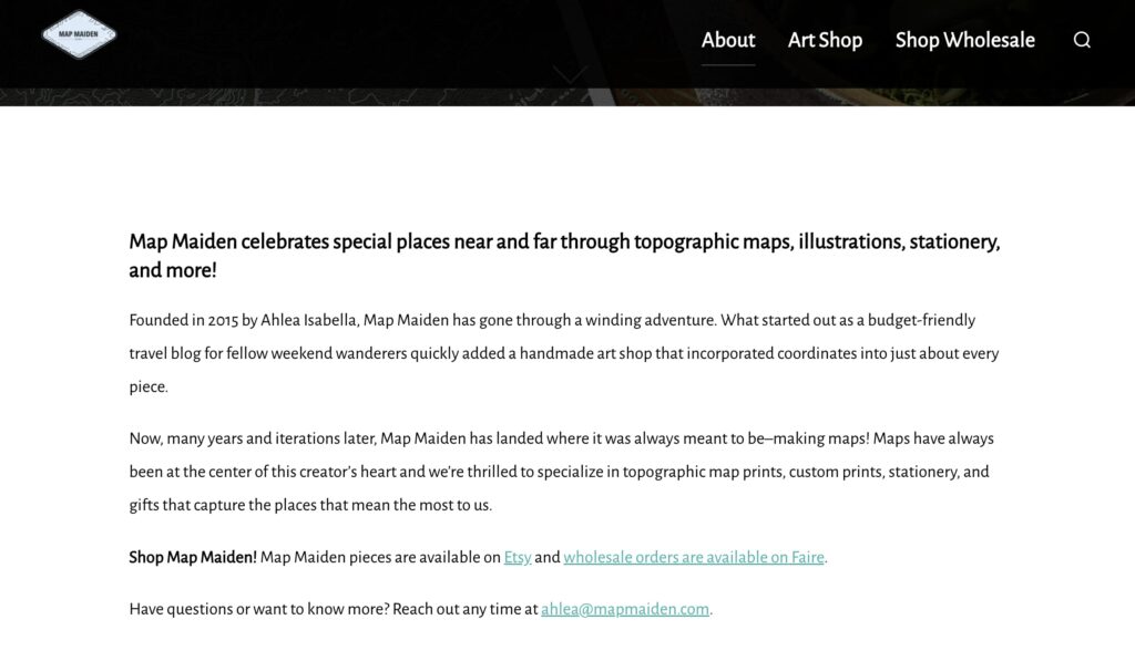 Now, many years and iterations later, Map Maiden has landed where it was always meant to be–making maps! Maps have always been at the center of this creator’s heart and we’re thrilled to specialize in topographic map prints, custom prints, stationery, and gifts that capture the places that mean the most to us.