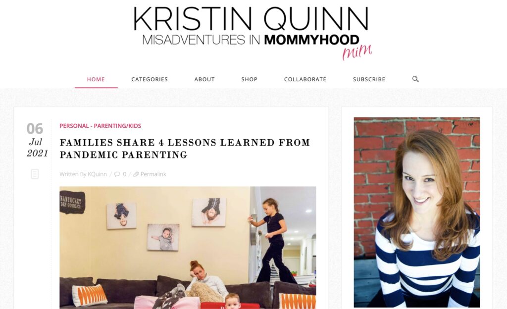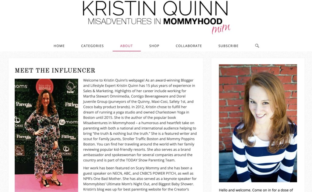 Welcome to Kristin Quinn’s webpage! As an award-winning Blogger and Lifestyle Expert Kristin Quinn has 15 plus years of experience in Sales & Marketing. Highlights of her career include working for Martha Stewart Omnimedia, Contigo Beverageware and Dorel Juvenile Group (purveyors of the Quinny, Maxi-Cosi, Safety 1st, and Cosco baby product brands). In 2012, Kristin chose to fulfill her dream of running a yoga studio and owned Charlestown Yoga in Boston until 2015. She is the author of the popular book Misadventures in Mommyhood – a humorous and heartfelt take on parenting with both a national and international audience helping to bring “the truth & nothing but the truth.” She is a featured writer and scout for Family Jaunts, Stroller Traffic Boston and Mommy Poppins Boston. You can find her traveling around the world with her family reviewing popular kid-friendly resorts. She also serves as a brand ambassador and spokeswoman for several companies around the country and is part of the TODAY Show Parenting Team.