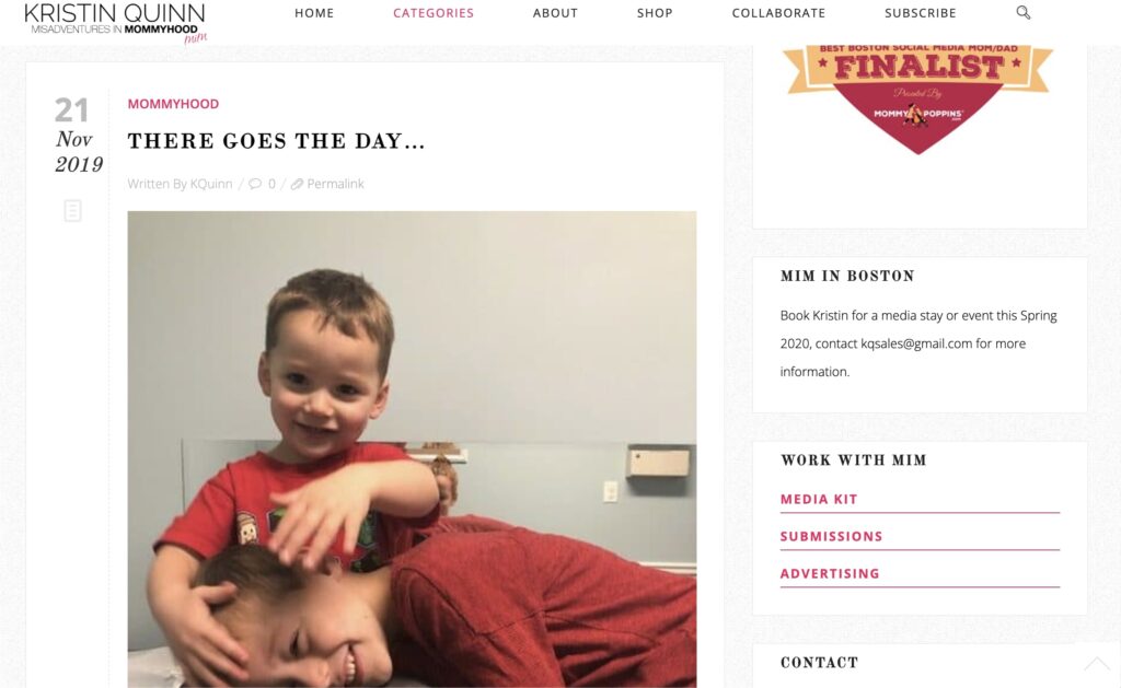 Her work has been featured on Scary Mommy and she has been a guest speaker on NECN, ABC, and CNBC’S POWER PITCH, as well as NPR’s One Bad Mother. She has also served as a keynote speaker for Mommybites’ Ultimate Mom’s Night Out, and Biggest Baby Shower. Kristin’s blog was up for best parenting website for the Creator’s Choice Awards in 2015 and Best Social Media Mom in Boston in 2016. She won 1st runner-up for the latter among 10 other finalists. Kristin lives with her husband and three young children outside of Boston.