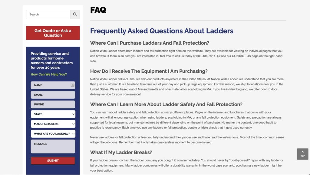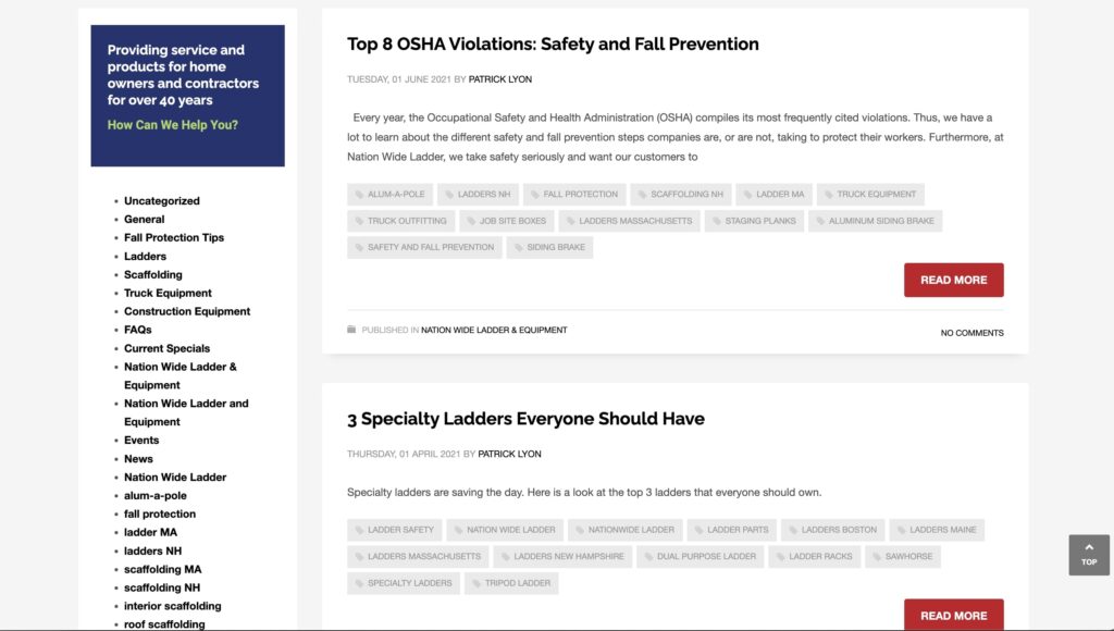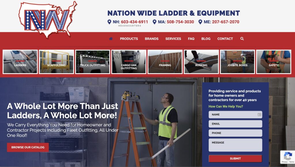 Nation Wide Ladder and Equipment (originally known as Manchester Ladder Company) was founded in 1975. Based in Windham, NH, they also have other locations across New England and serve customers throughout the northeast. As well as selling ladders and scaffolding, they also offer truck and van fit-outs, roofing, safety equipment, and more. Nation Wide Ladder and Equipment is known not just for their scaffolding and ladder sales, but also their installation services and ladder repair.