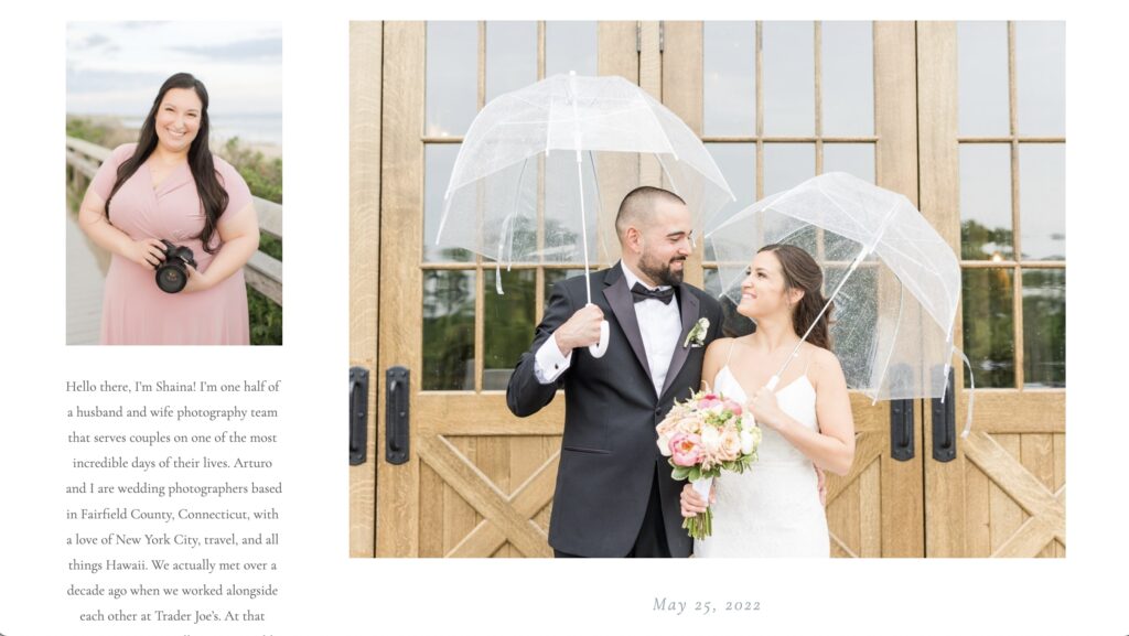 I’m Shaina, a wedding photographer based in Fairfield County, Connecticut. My career began over 10 years ago in my sophomore year of college while I was working toward my Bachelor of Arts in Photography. As I explored photographing families, headshots, and more, my heart always landed back with couples and weddings!
