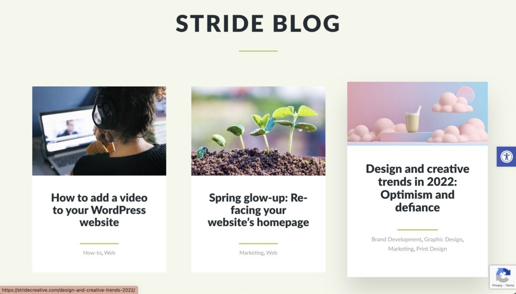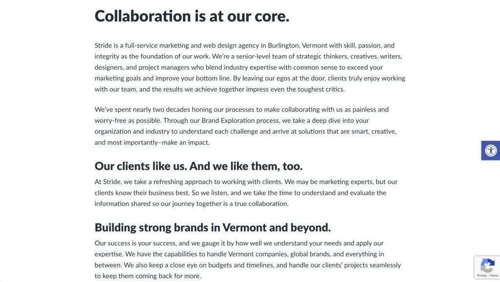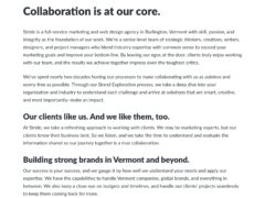 Stride is a full-service marketing and web design agency in Burlington, Vermont with skill, passion, and integrity as the foundation of our work. We’re a senior-level team of strategic thinkers, creatives, writers, designers, and project managers who blend industry expertise with common sense to exceed your marketing goals and improve your bottom line. By leaving our egos at the door, clients truly enjoy working with our team, and the results we achieve together impress even the toughest critics.