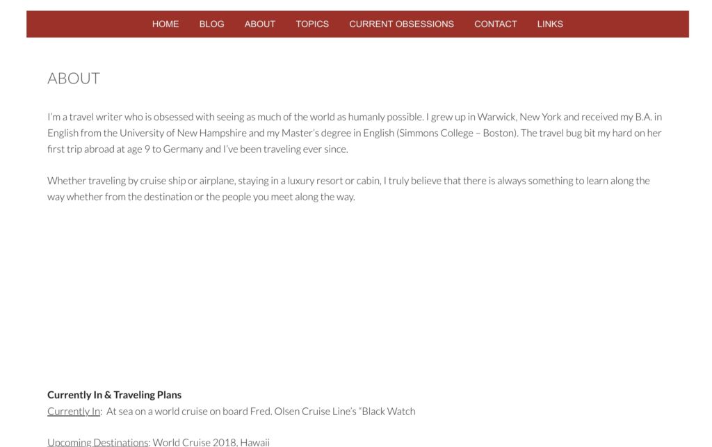 I’m a travel writer who is obsessed with seeing as much of the world as humanly possible. I grew up in Warwick, New York and received my B.A. in English from the University of New Hampshire and my Master’s degree in English (Simmons College – Boston). The travel bug bit my hard on her first trip abroad at age 9 to Germany and I’ve been traveling ever since.