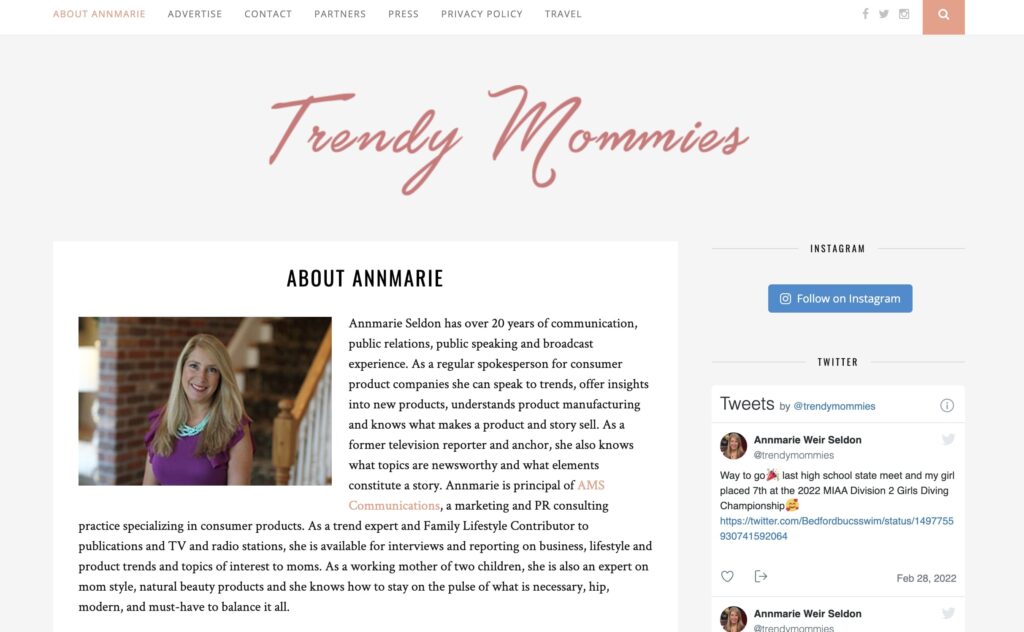 Annmarie Seldon has over 20 years of communication, public relations, public speaking and broadcast experience. As a regular spokesperson for consumer product companies she can speak to trends, offer insights into new products, understands product manufacturing and knows what makes a product and story sell. As a former television reporter and anchor, she also knows what topics are newsworthy and what elements constitute a story. Annmarie is principal of AMS Communications, a marketing and PR consulting practice specializing in consumer products. As a trend expert and Family Lifestyle Contributor to publications and TV and radio stations, she is available for interviews and reporting on business, lifestyle and product trends and topics of interest to moms. As a working mother of two children, she is also an expert on mom style, natural beauty products and she knows how to stay on the pulse of what is necessary, hip, modern, and must-have to balance it all.