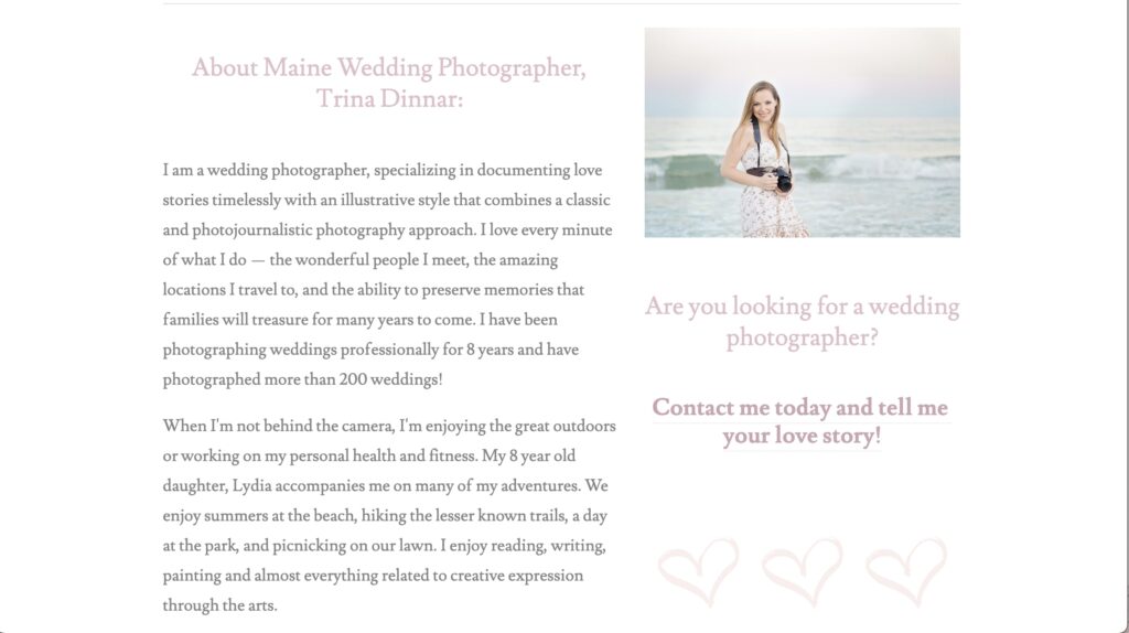 When I’m not behind the camera, I’m enjoying the great outdoors or working on my personal health and fitness. My 8 year old daughter, Lydia accompanies me on many of my adventures. We enjoy summers at the beach, hiking the lesser known trails, a day at the park, and picnicking on our lawn. I enjoy reading, writing, painting and almost everything related to creative expression through the arts.